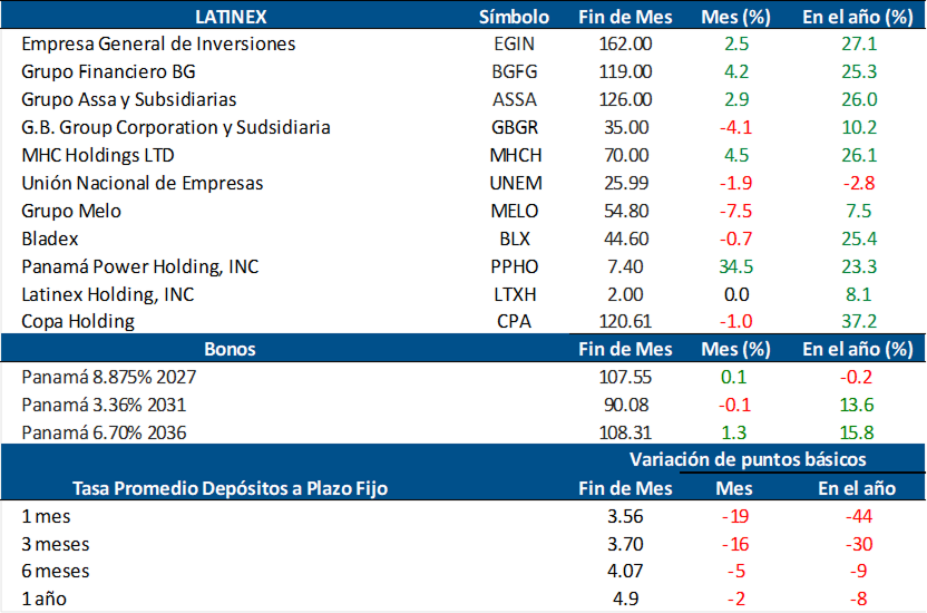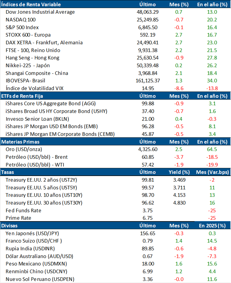 En Latinoamérica, la bolsa de Chile ganó en el mes 3.5%, la de Brasil subió 1.3%, la de México 1.1%, y la de Argentina 0.8%. La bolsa de Colombia perdió apenas 0.3%. En 2025, la bolsa de Chile se destacó con un alza de 56.2%, seguida por Colombia que ganó 49.9%, y de Brasil 34%.