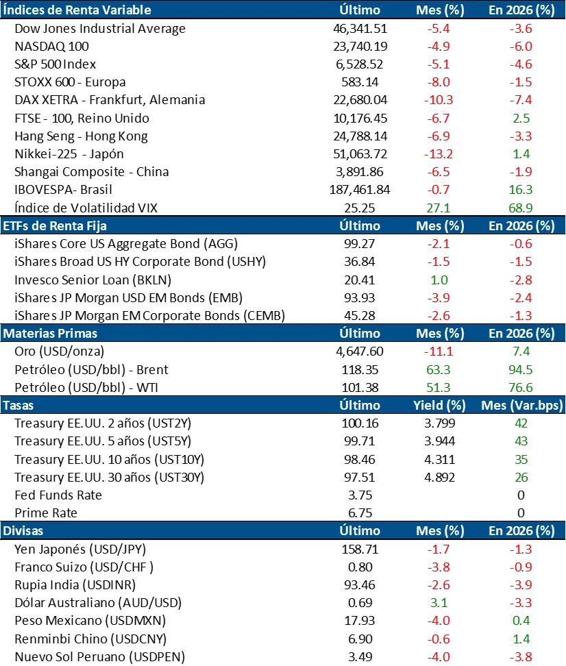 Las bolsas norteamericanas cerraron el mes de marzo con resultados mayormente negativos, en un contexto marcado por el conflicto en Medio Oriente y un mayor nivel de cautela por parte de los inversionistas. El índice Dow Jones cayó 5.4%, mientras que el S&P 500 retrocedió 5.1%. Por su parte, el Nasdaq 100 bajó 4.9% y el Nasdaq Composite 4.8%.