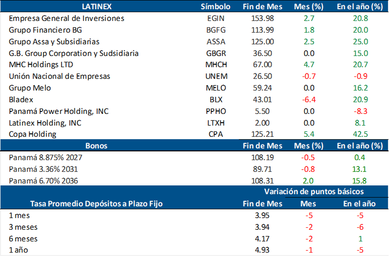 En Latinoamérica, se destacó al alza la bolsa de Argentina, que ganó 69.3% después del triunfo de Milei en las elecciones de medio término a nivel nacional. La bolsa de Chile subió en el mes 5.1% y la de Brasil +2.3%. Cayeron las bolsas de Colombia y México un 0.2%, respectivamente.